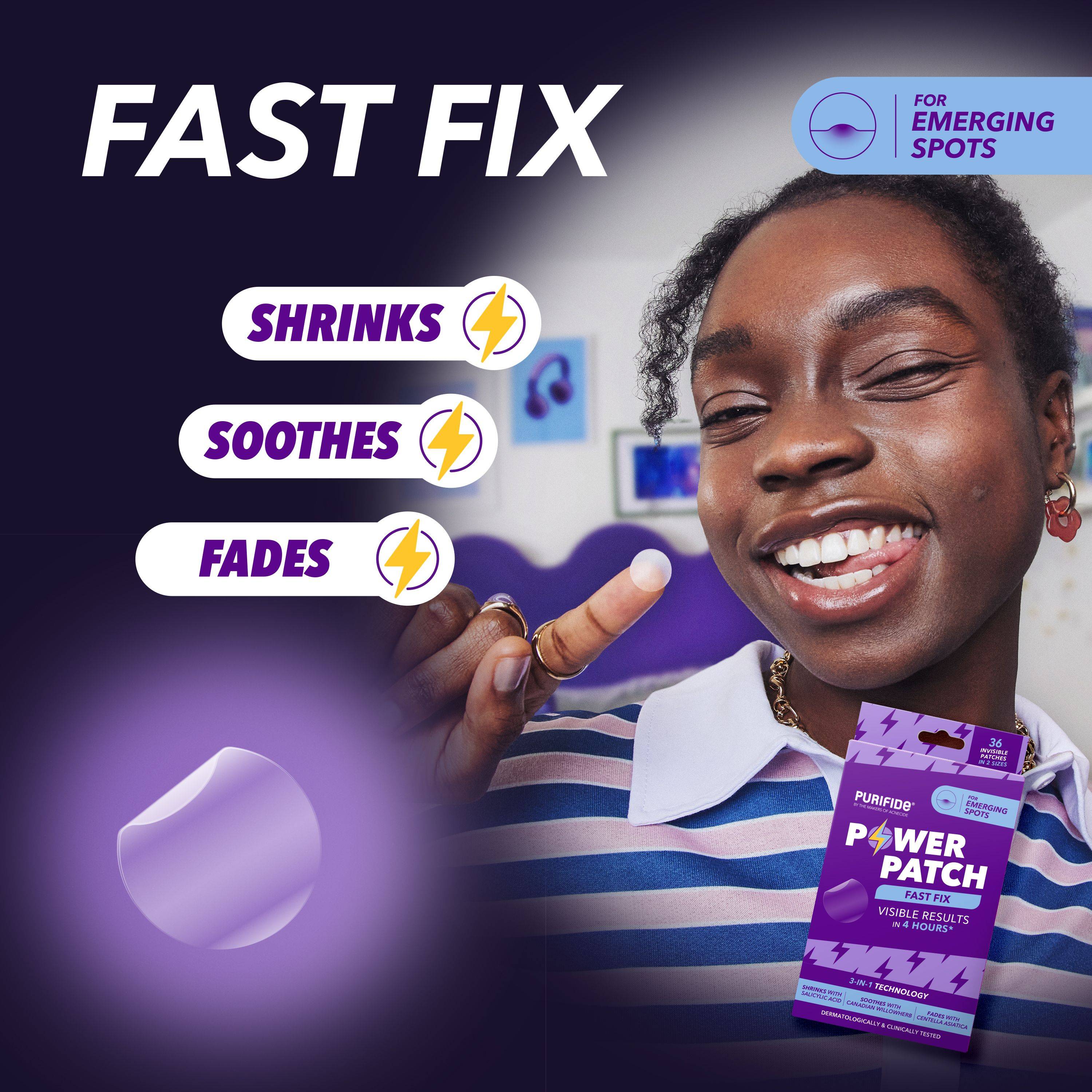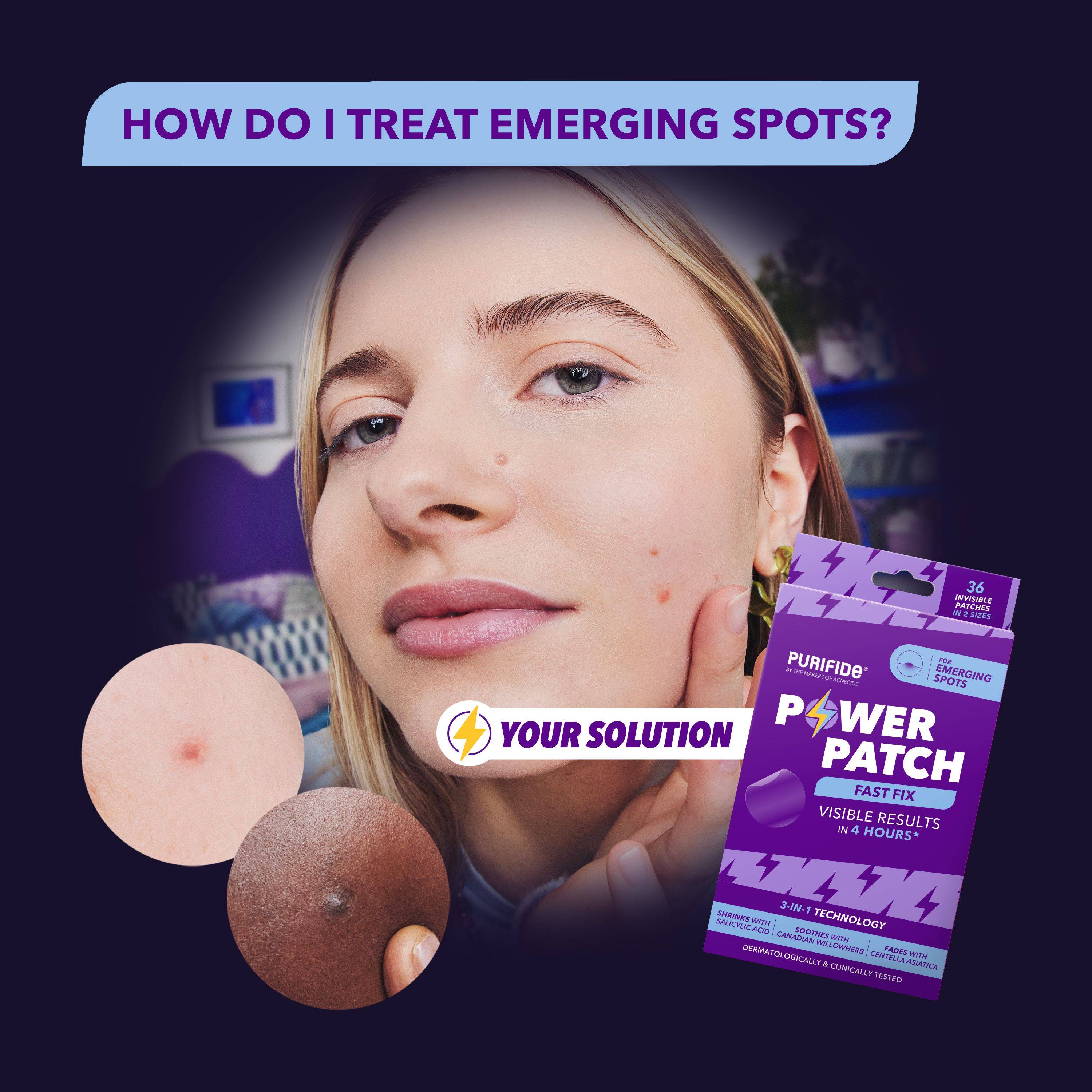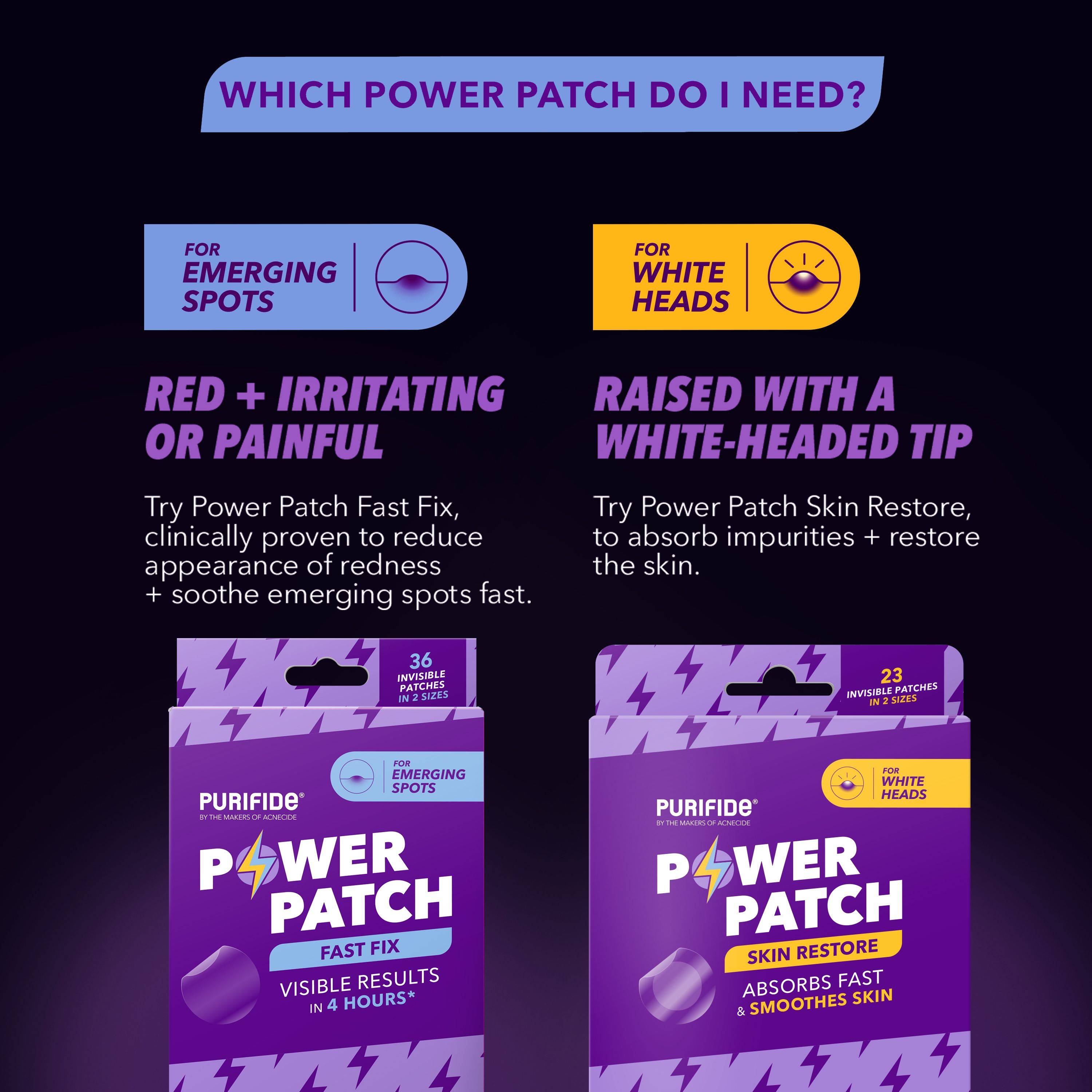 The Power Patch are invisible, ultra-thin spot patches with 3-in-1 technology to shrink, sooth and protect emerging spots.